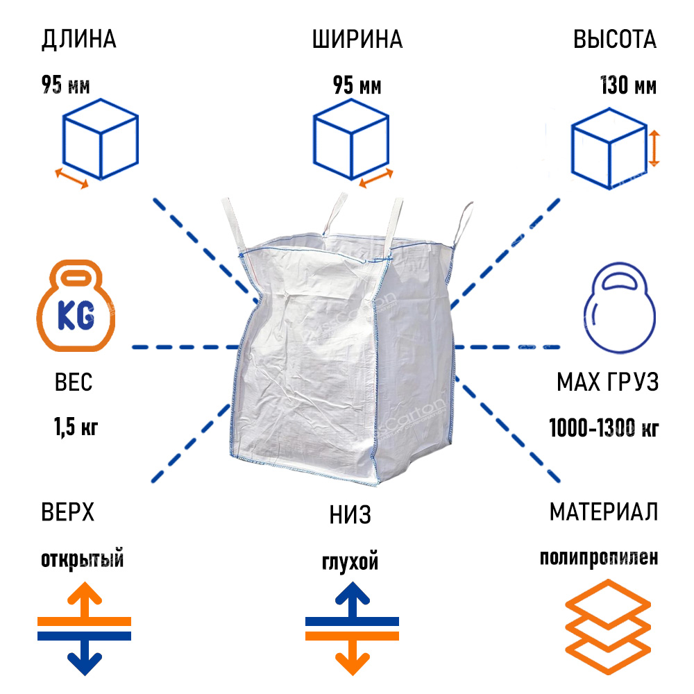 Прочный и вместительный мешок для транспортировки и хранения сыпучих материалов. Размеры 95х95х130 см позволяют эффективно использовать пространство. Открытый верх обеспечивает удобную загрузку, а глухое дно предотвращает просыпание содержимого. Изготовлен из высококачественного полипропилена, устойчивого к разрывам и воздействию влаги. Идеален для строительных материалов, сельскохозяйственной продукции и промышленных отходов. Биг-бэг мешок 95х95х130 см выдерживает значительные нагрузки, что делает его надежным помощником в логистике и хранении. Подходит для многократного использования, экономя ваши ресурсы.